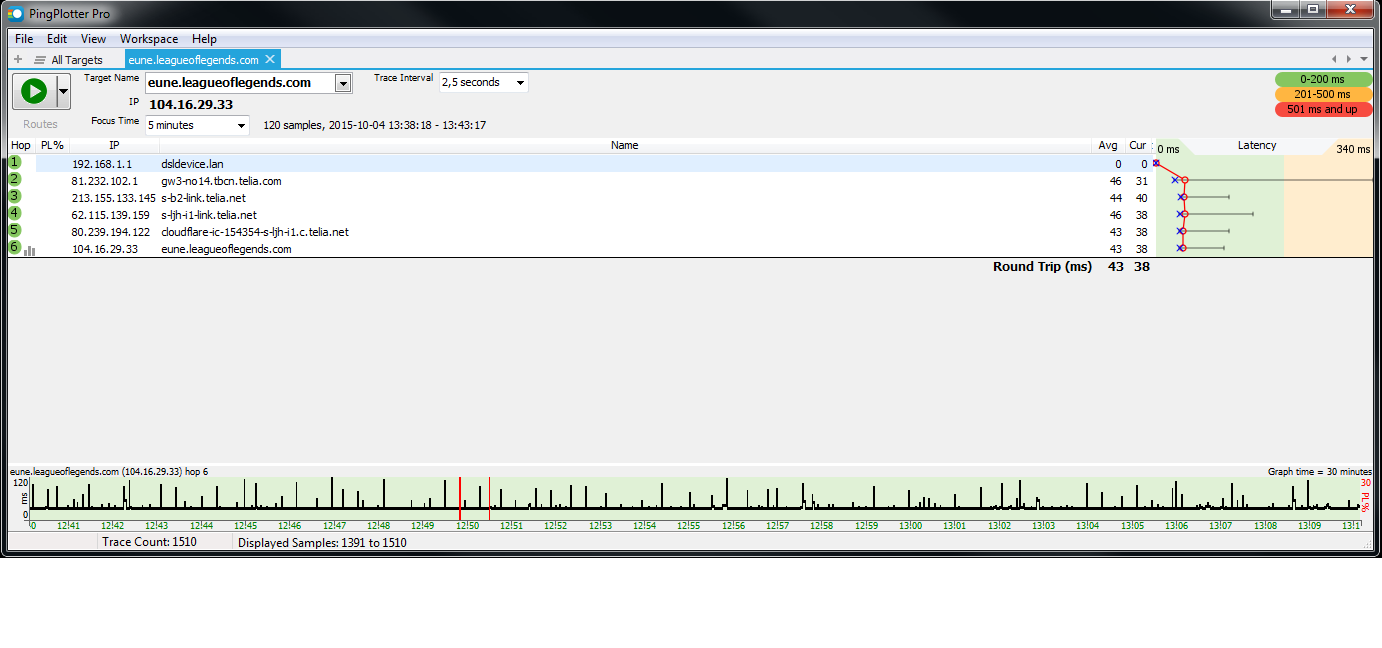 As the title suggests, my internet is acting up on me. I'm a huge gamefreak and I recently moved and thus got a new internet, which isn't working properly. I get huge pingspikes when playing games, so I thought I'd try pingplotter out, but since I'm new I'm having a hard time interprating the data. I'd appreciate some help. Cheers.