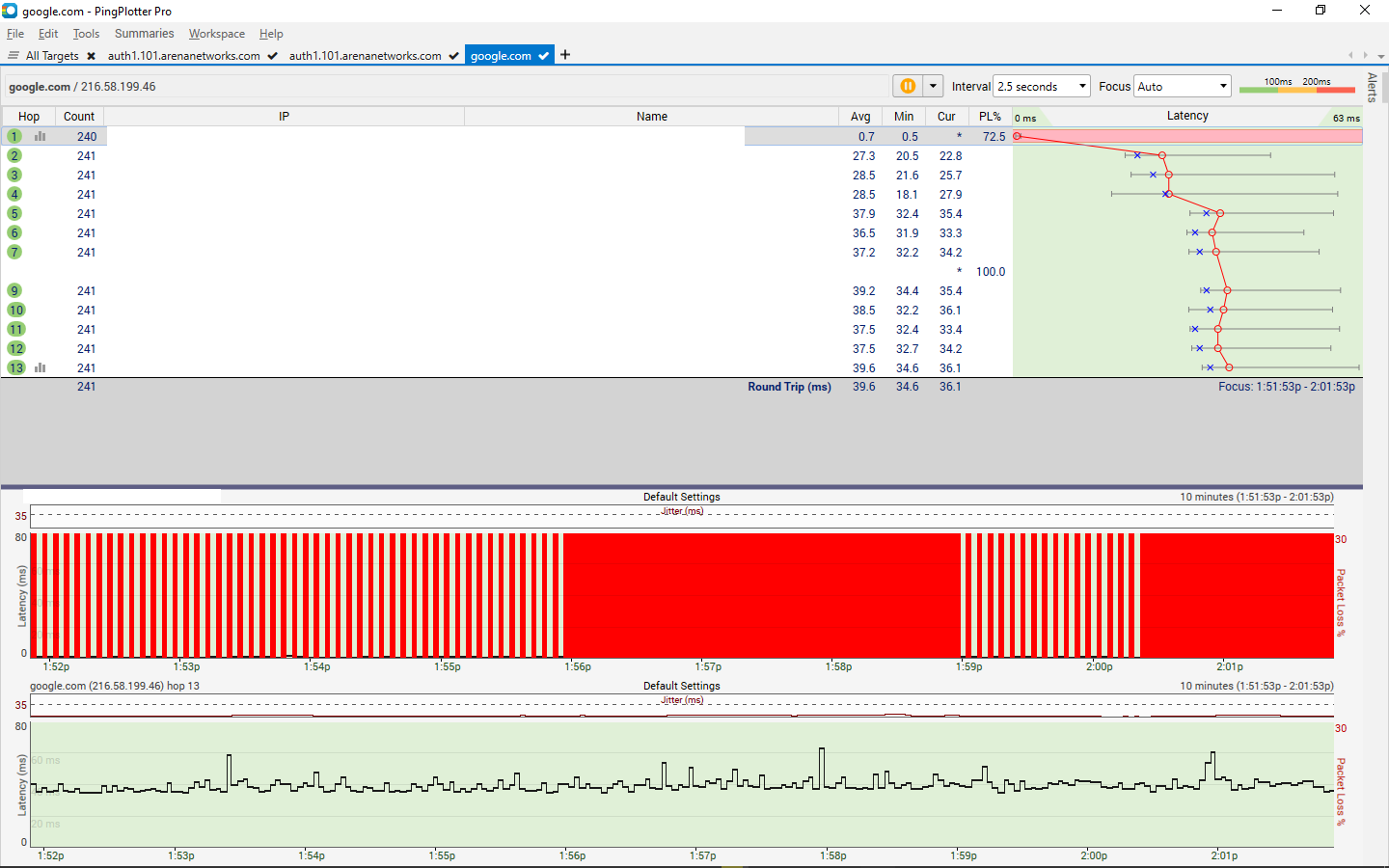 I'll hopefully have attached a few sample images below, of different patterns that I've been noticing in terms of packet-loss, they should speak for themselves. The first few attachments were done to a game-server for one of the main games that I play, though the last two are cnnecting to Google.