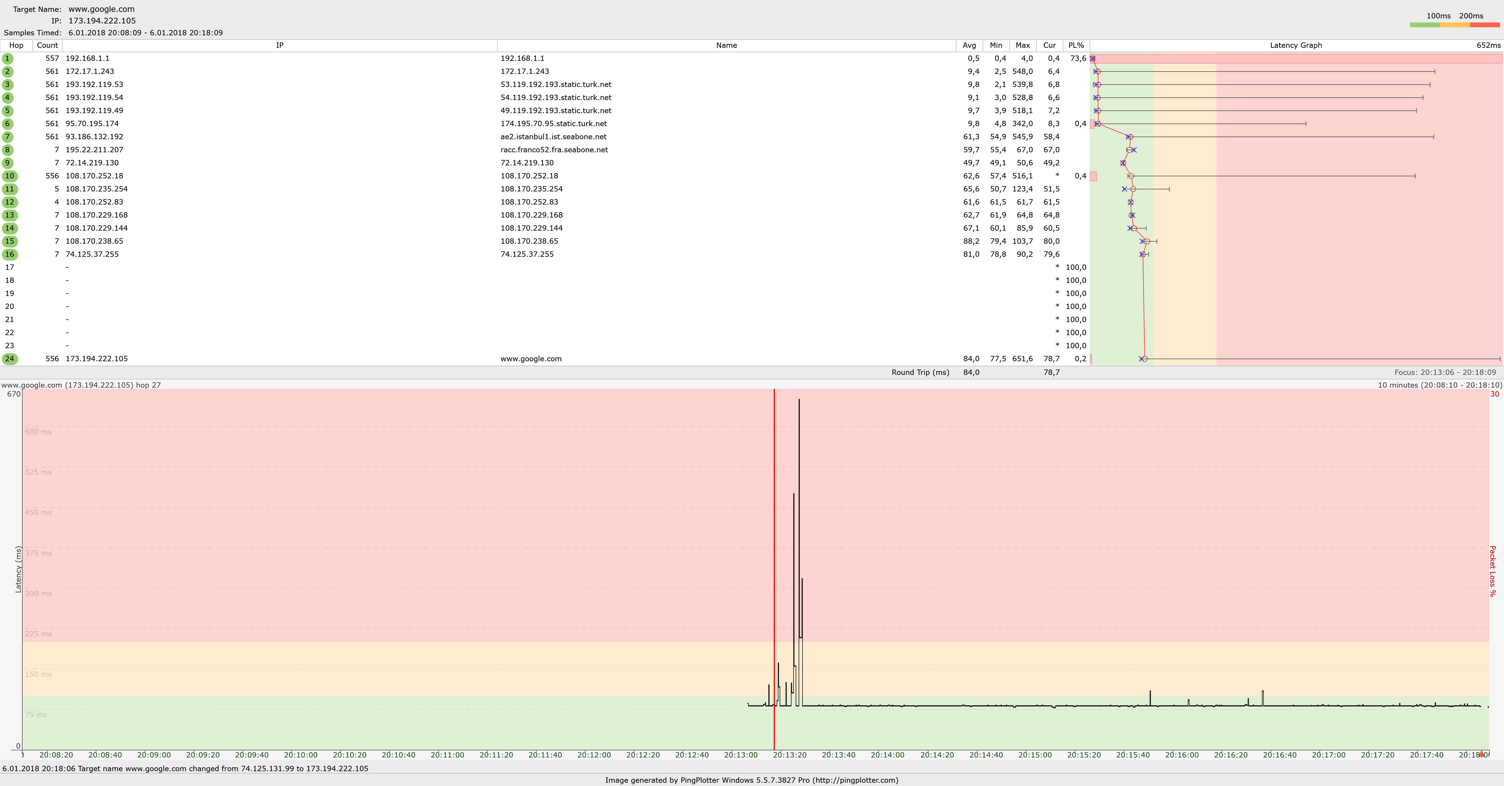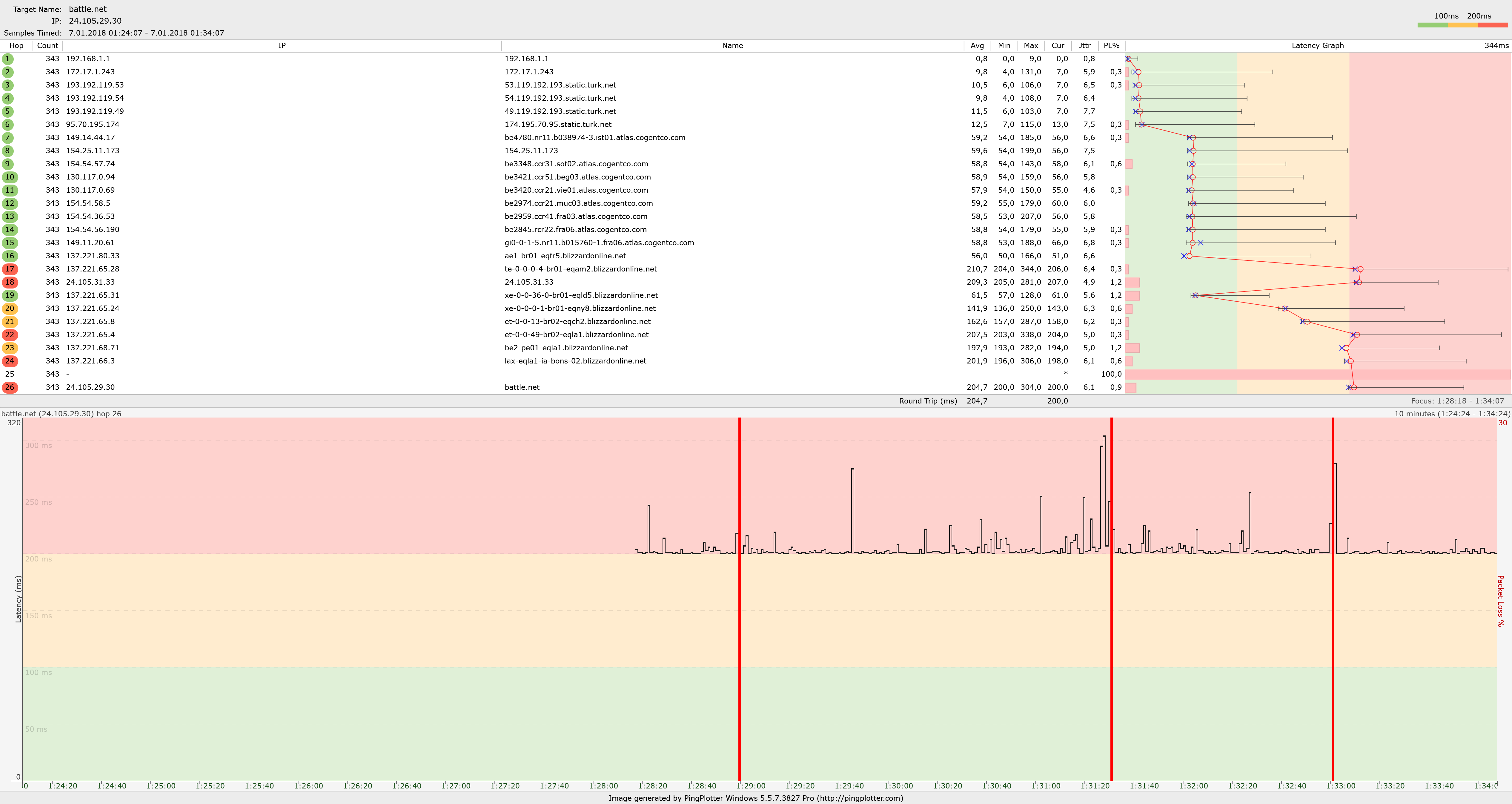 If you're having troubles accessing a service, I don't have enough data to be able to help identify the culprit; you'll need to let these traces run for quite some time and investigate the results to be sure. You may need to do some more digging before you come up with where the problem lies. Since you might be experiencing some issues with a service, your goal here is going to be to correlate the issues you're having to PingPlotter patterns. You'll want to start a trace running to the service you're trying to access, and leave that running while you're using the service. When you're experiencing poor connection quality, make a note somewhere, and look back on your PingPlotter data to see if you can find a problem pattern that relates to when the undesired behavior first started.