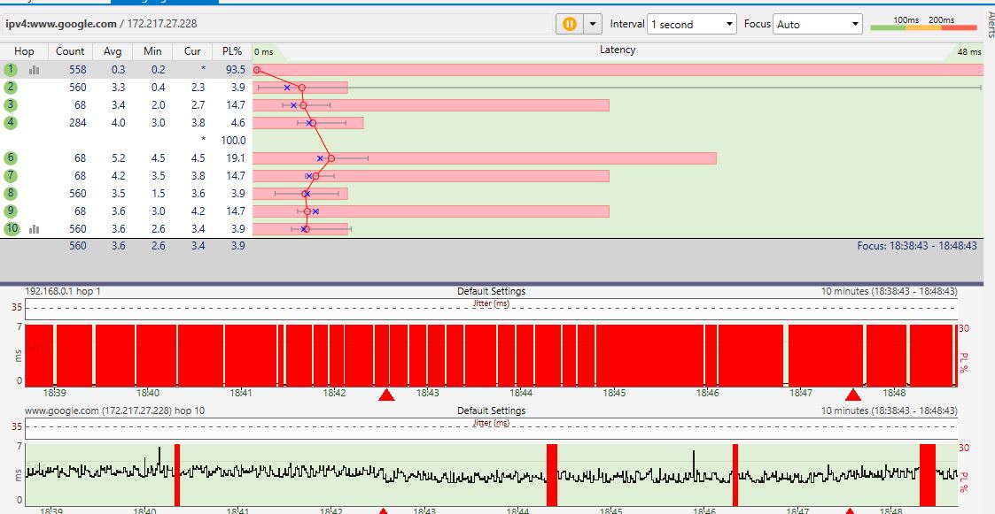 http://www.pingman.com/kb/47 We've also got a great guide that goes over how to use PingPlotter to troubleshoot network issues, which may also prove helpful to you here: